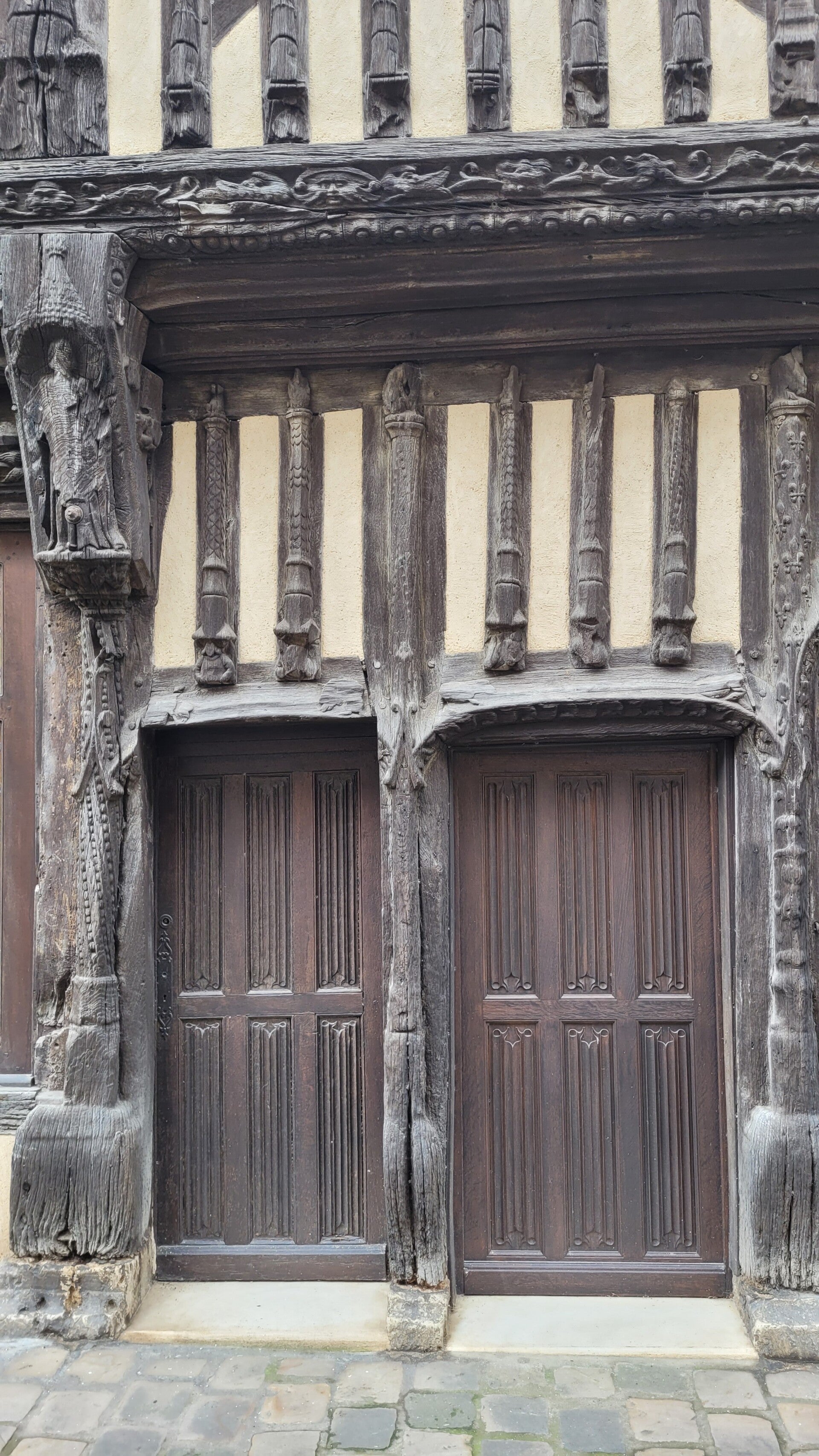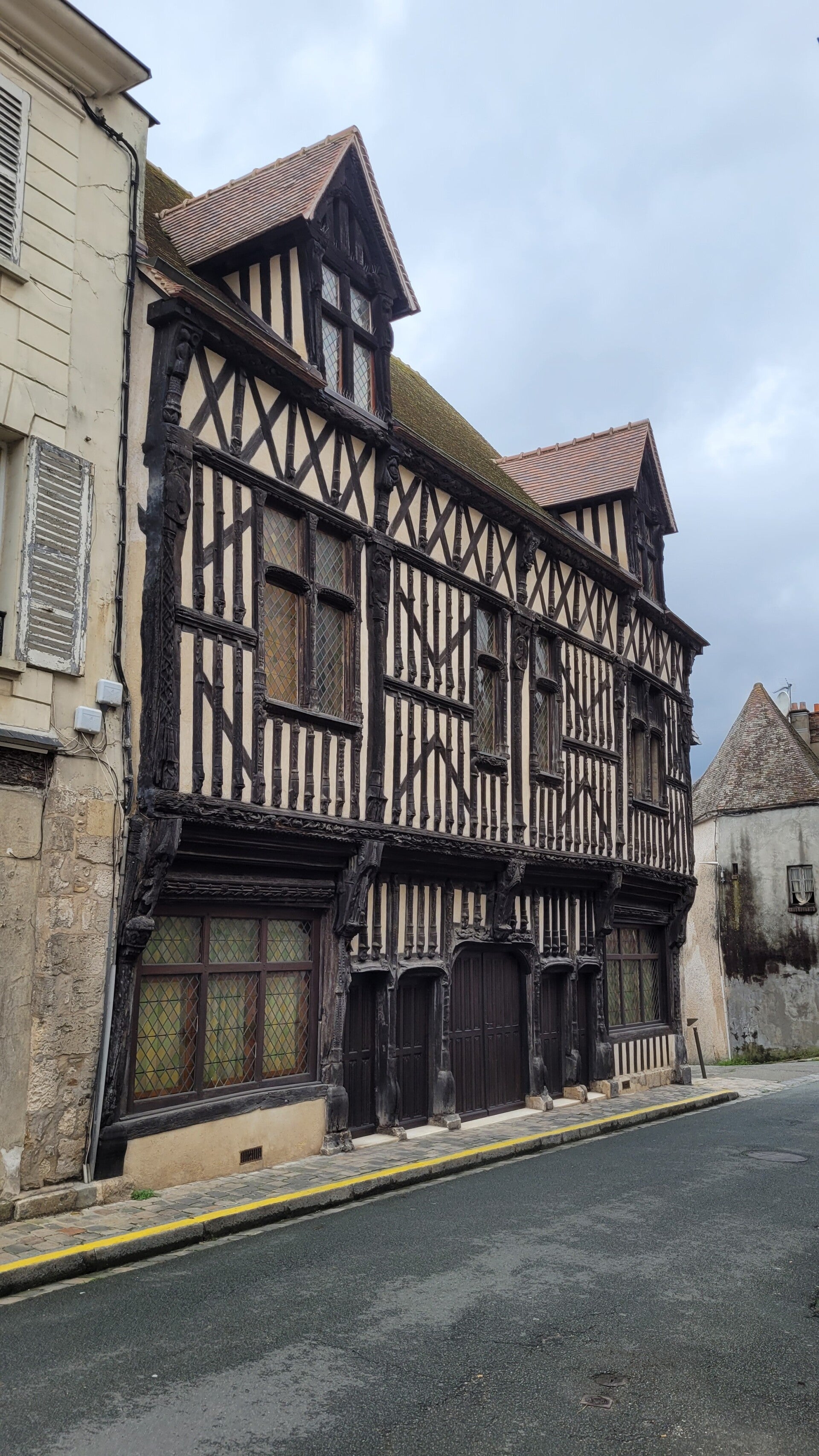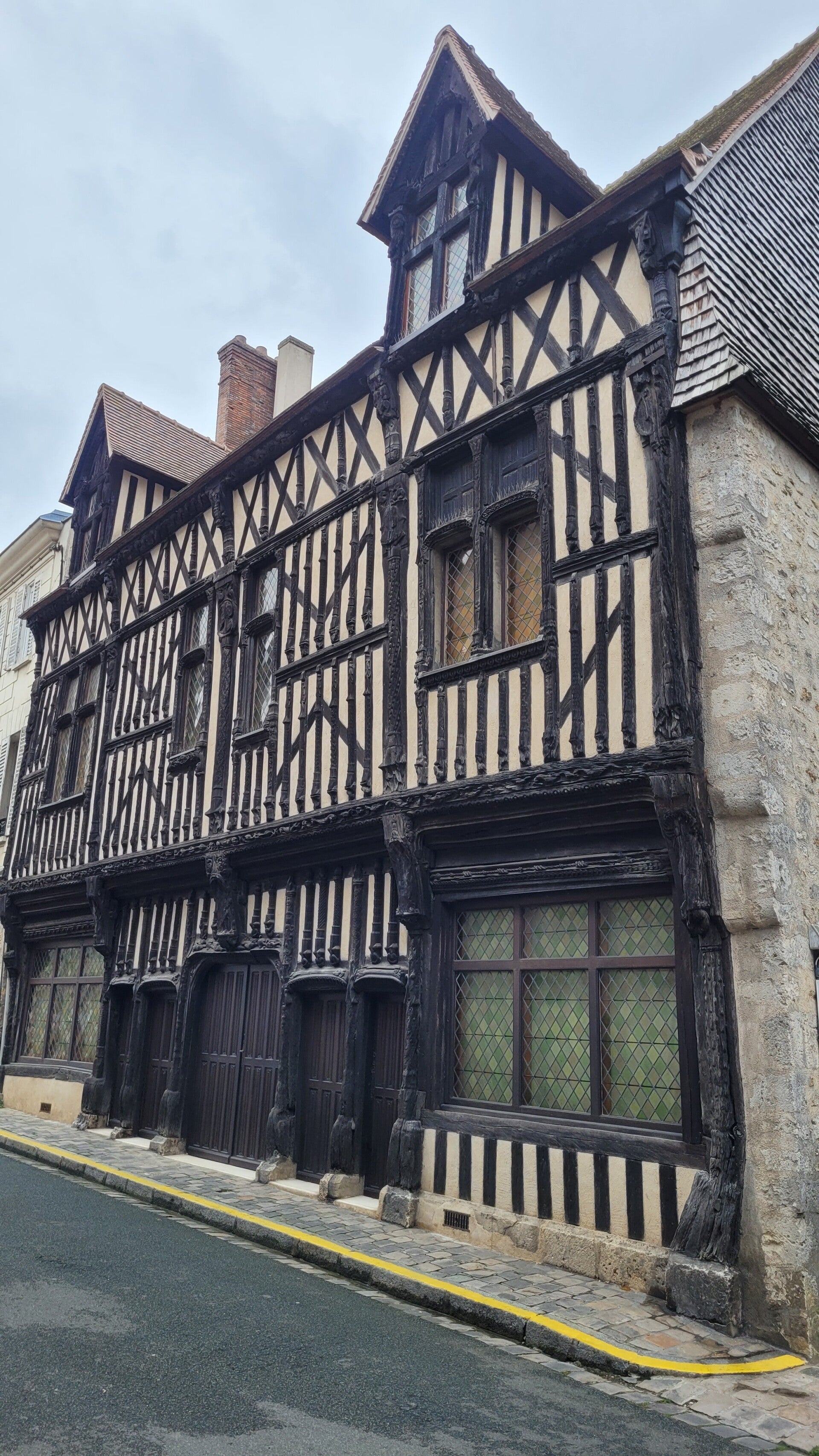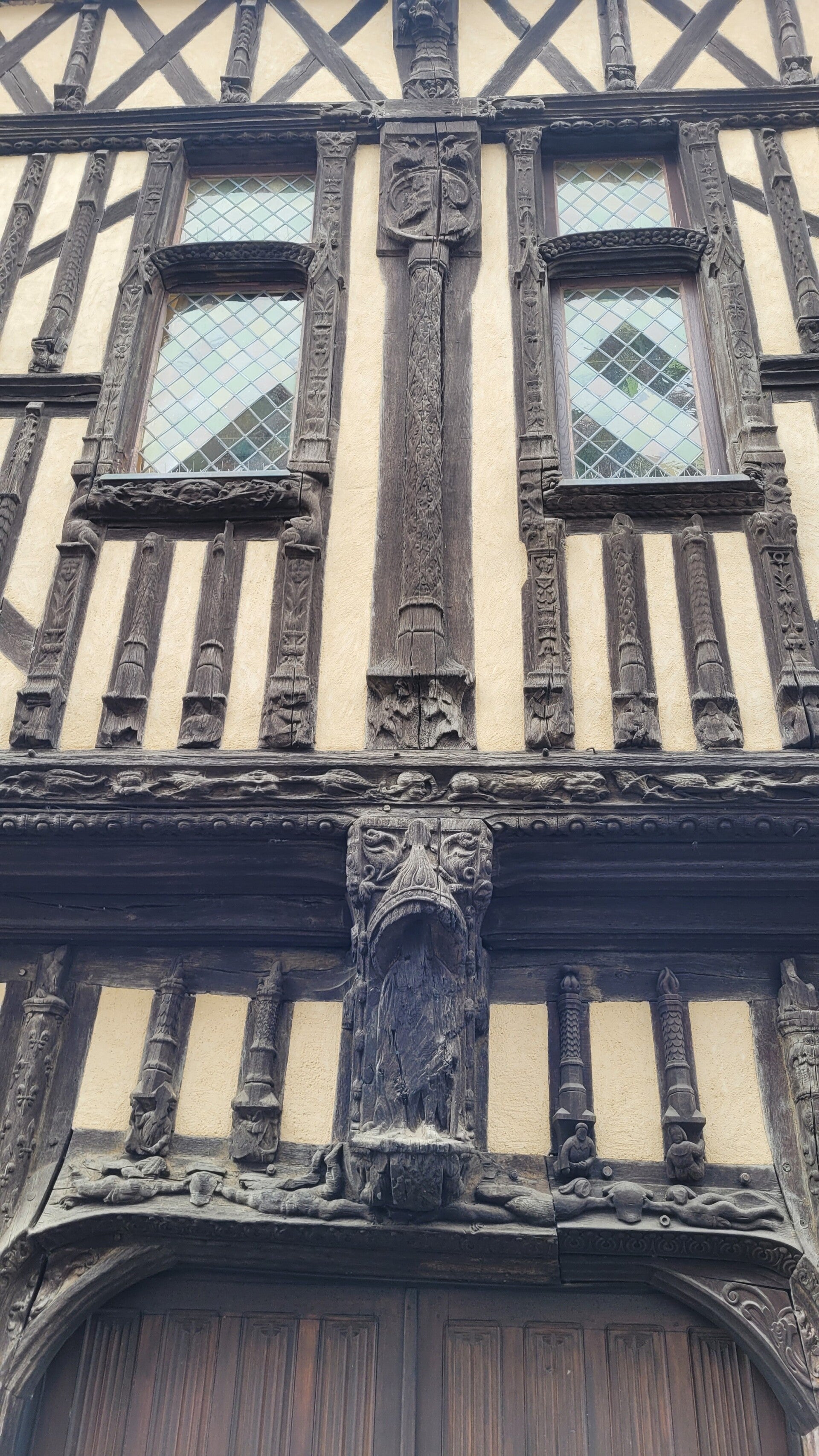 La façade, construite en pans de bois et en encorbellement est l’une des plus belles de France. On dénombre 88 pans de bois verticaux. L’ensemble de la façade est orné de sculptures dont des animaux fantastiques. On y distingue aussi le cygne et la salamandre qui étaient respectivement les emblèmes de Claude de France et de François 1er mutilés et des personnages de noblesse de robe. Au centre, la représentation d’un blason avec quatre lions rampants pourrait être la représentation de l’emblème du bailli de l’époque.