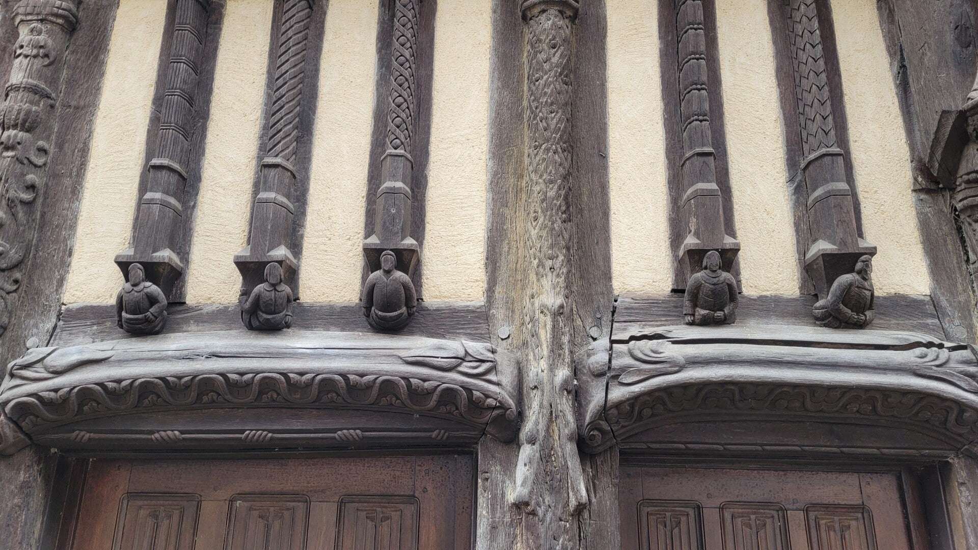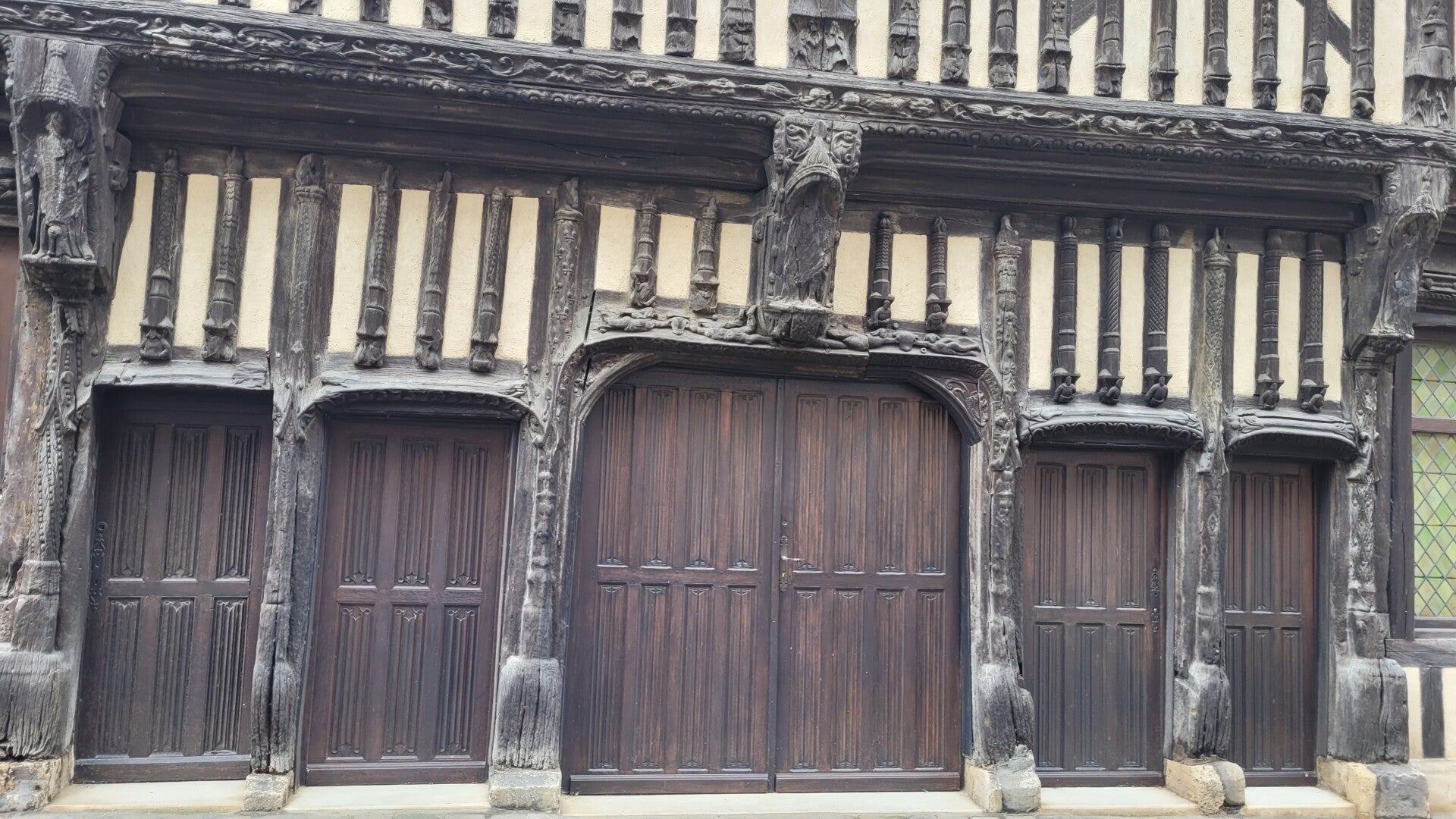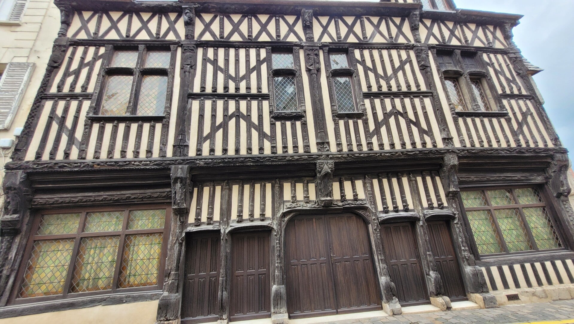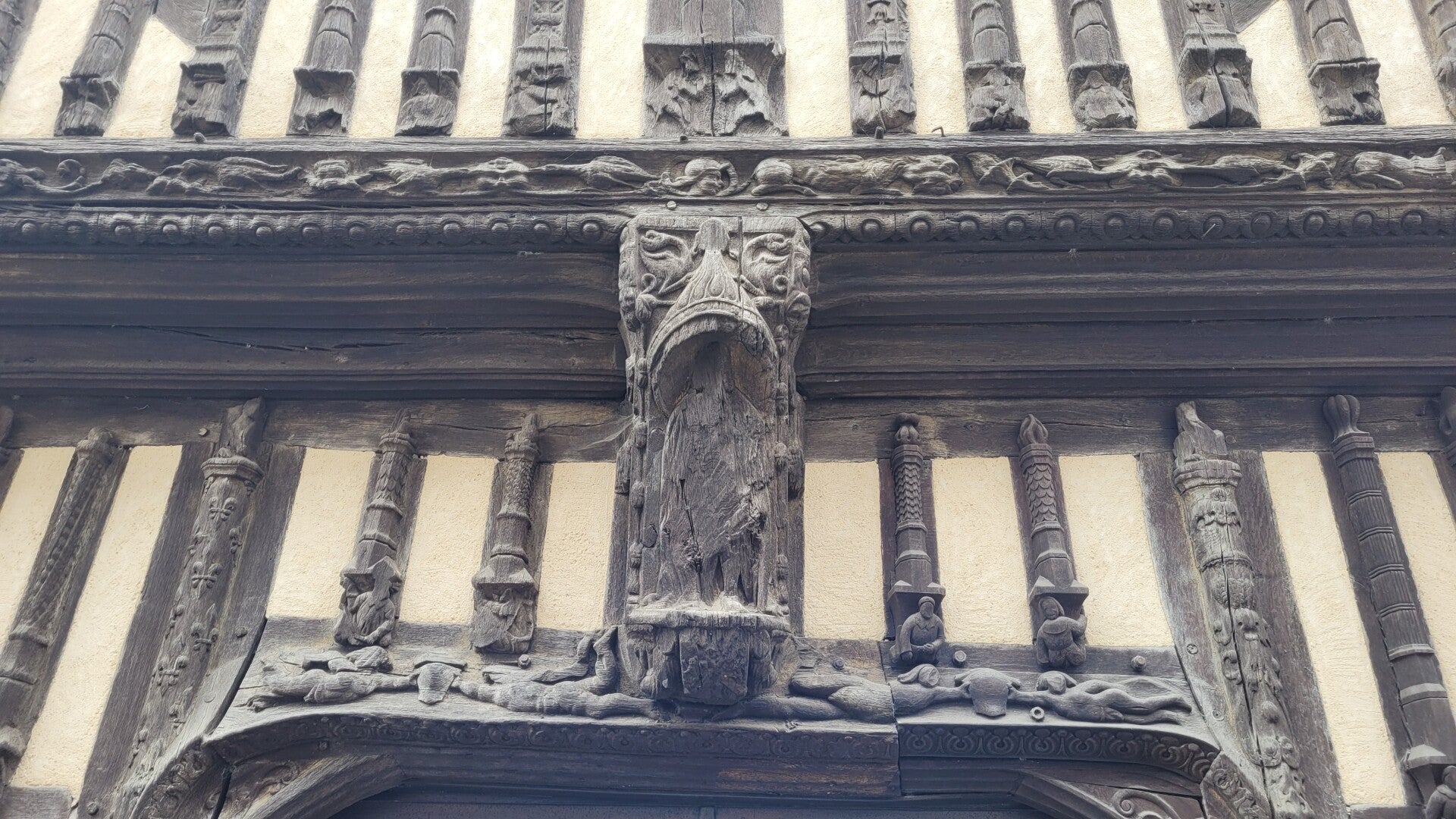 La façade, construite en pans de bois et en encorbellement est l’une des plus belles de France. On dénombre 88 pans de bois verticaux. L’ensemble de la façade est orné de sculptures dont des animaux fantastiques. On y distingue aussi le cygne et la salamandre qui étaient respectivement les emblèmes de Claude de France et de François 1er mutilés et des personnages de noblesse de robe. Au centre, la représentation d’un blason avec quatre lions rampants pourrait être la représentation de l’emblème du bailli de l’époque.
