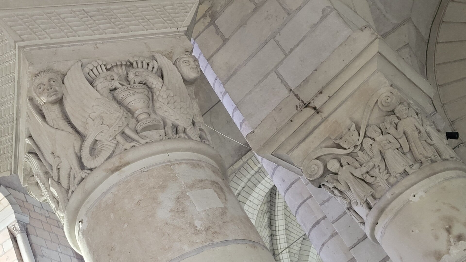 Dans la nef, parmis de très beaux chapiteaux romans se trouvent des copies du XIXe siècle.
