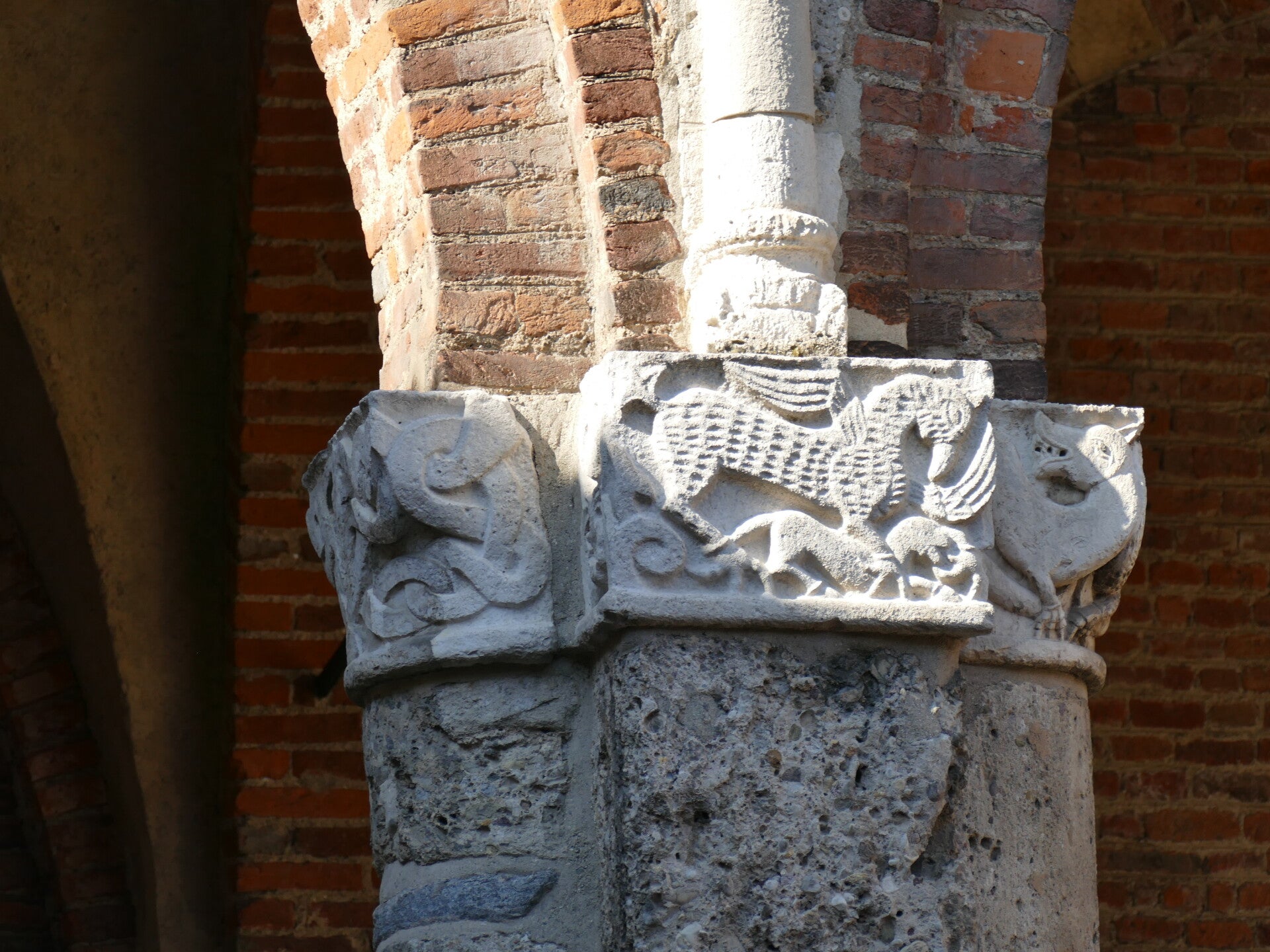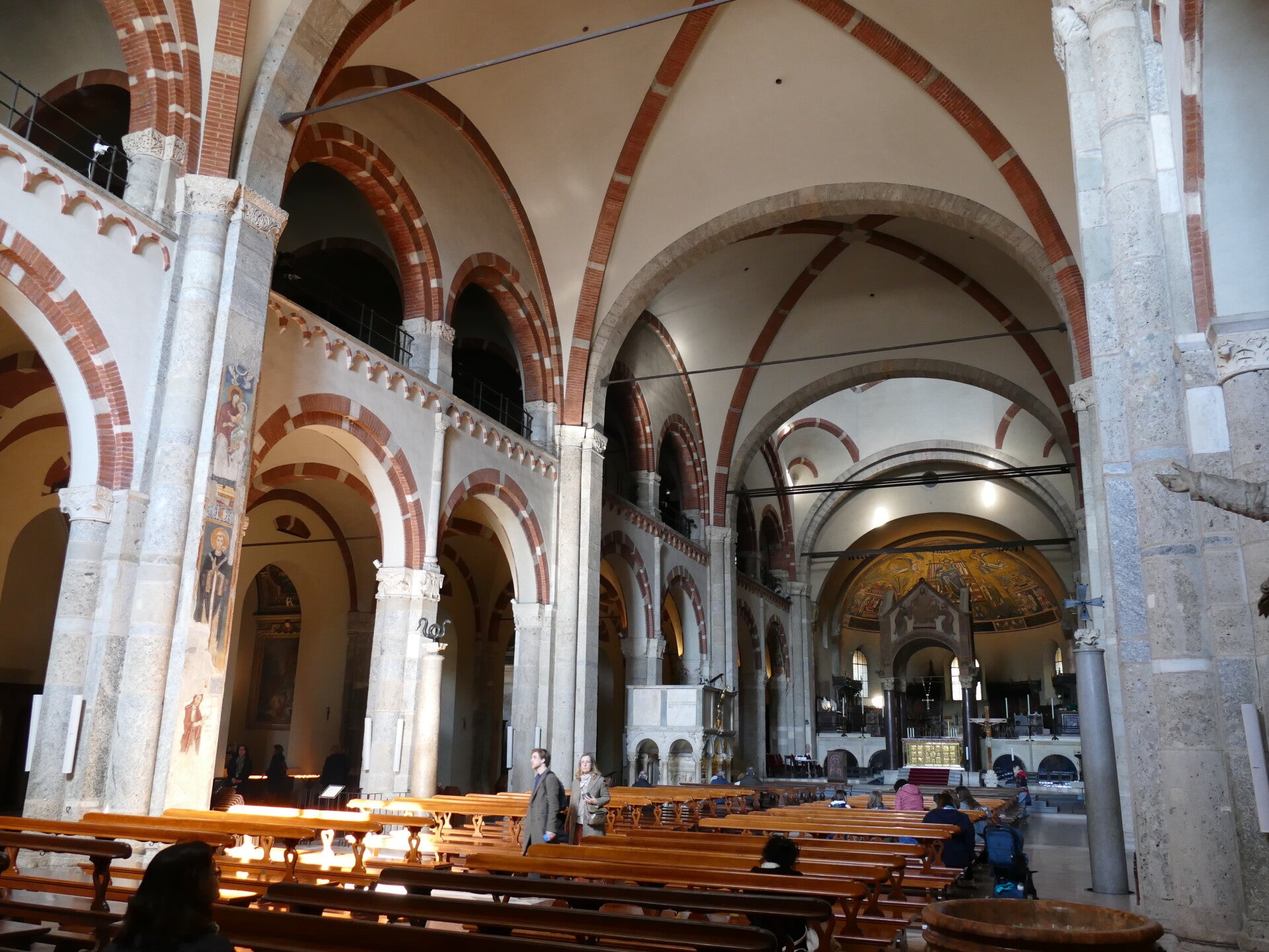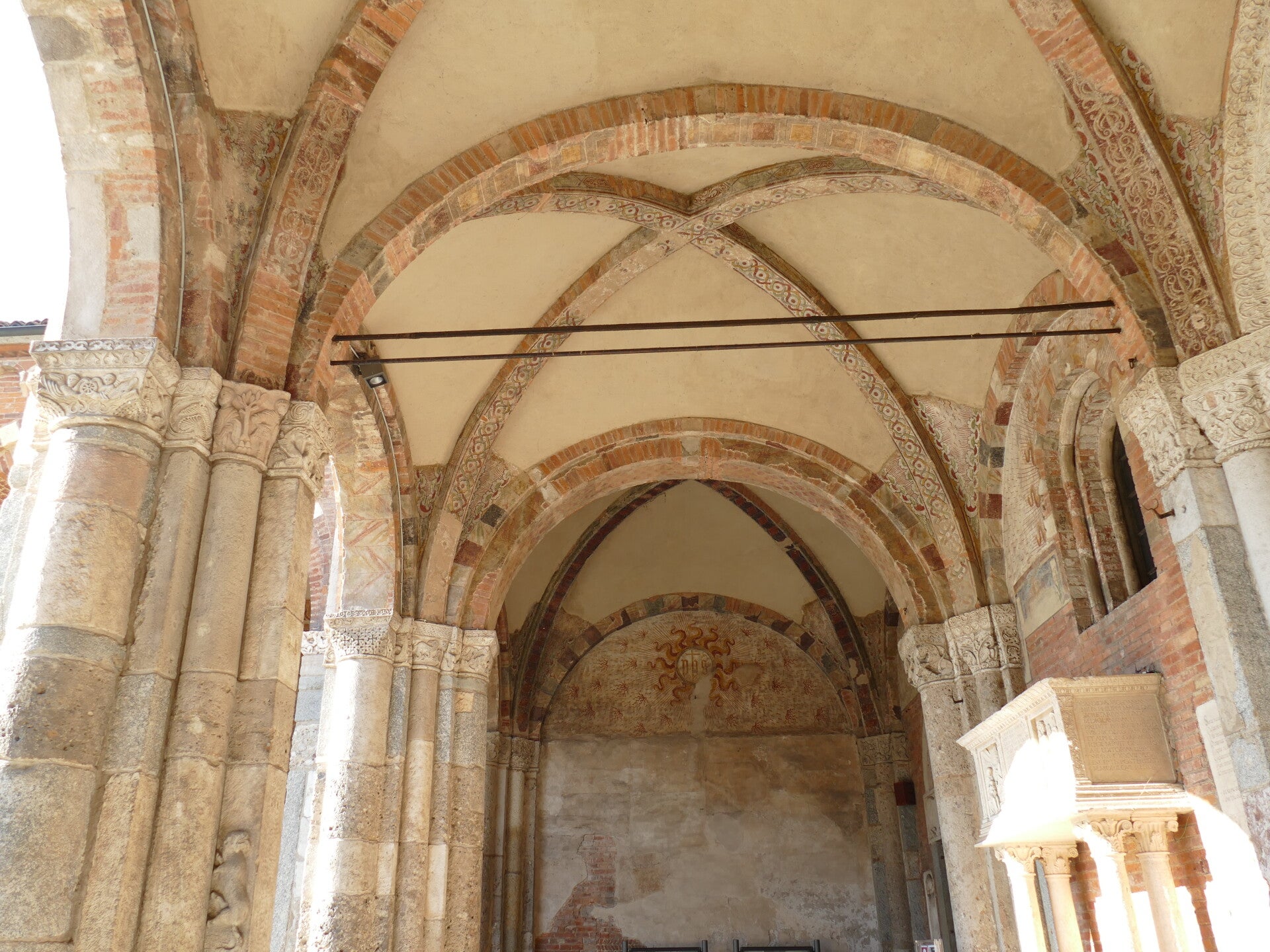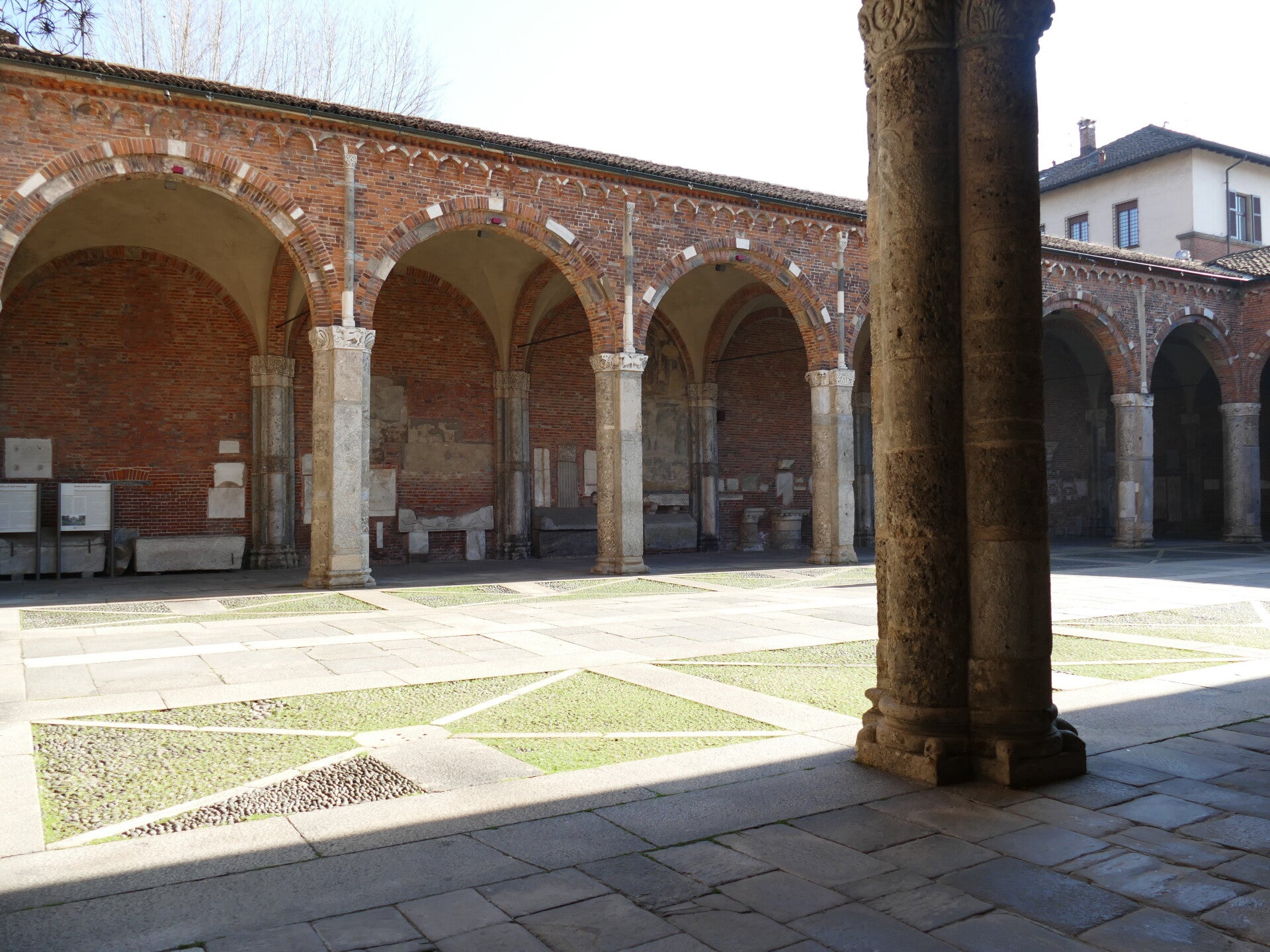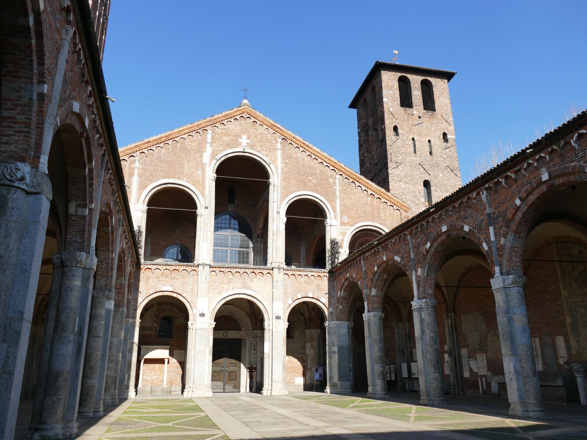 Ce premier abord surprenant peut attiser la curiosité et cela à raison. En effet, une fois passé l’entrée, c’est dans une grande cour que l’on débouche. Cette cour, ou plutôt cet atrium, est entouré d’arcades qui s’enchaînent sur les quatre côtés, toujours avec la belle couleur des briques. Cet atrium offre une belle entrée en matière à la basilique. Ce qui amène donc à la suite et à l’intérieur de Sant’Ambrogio.