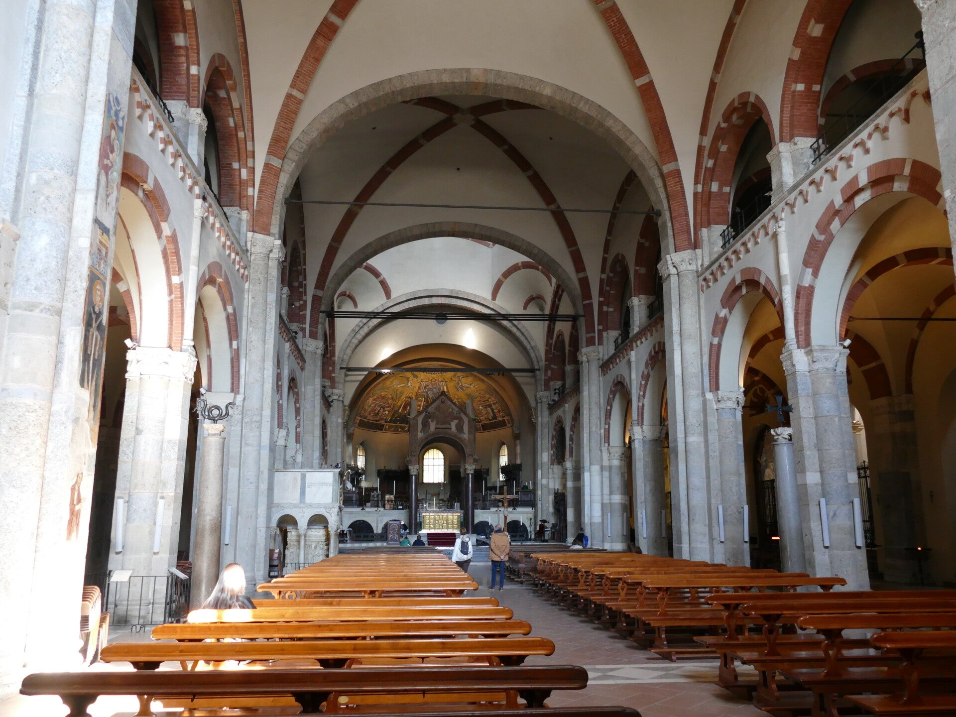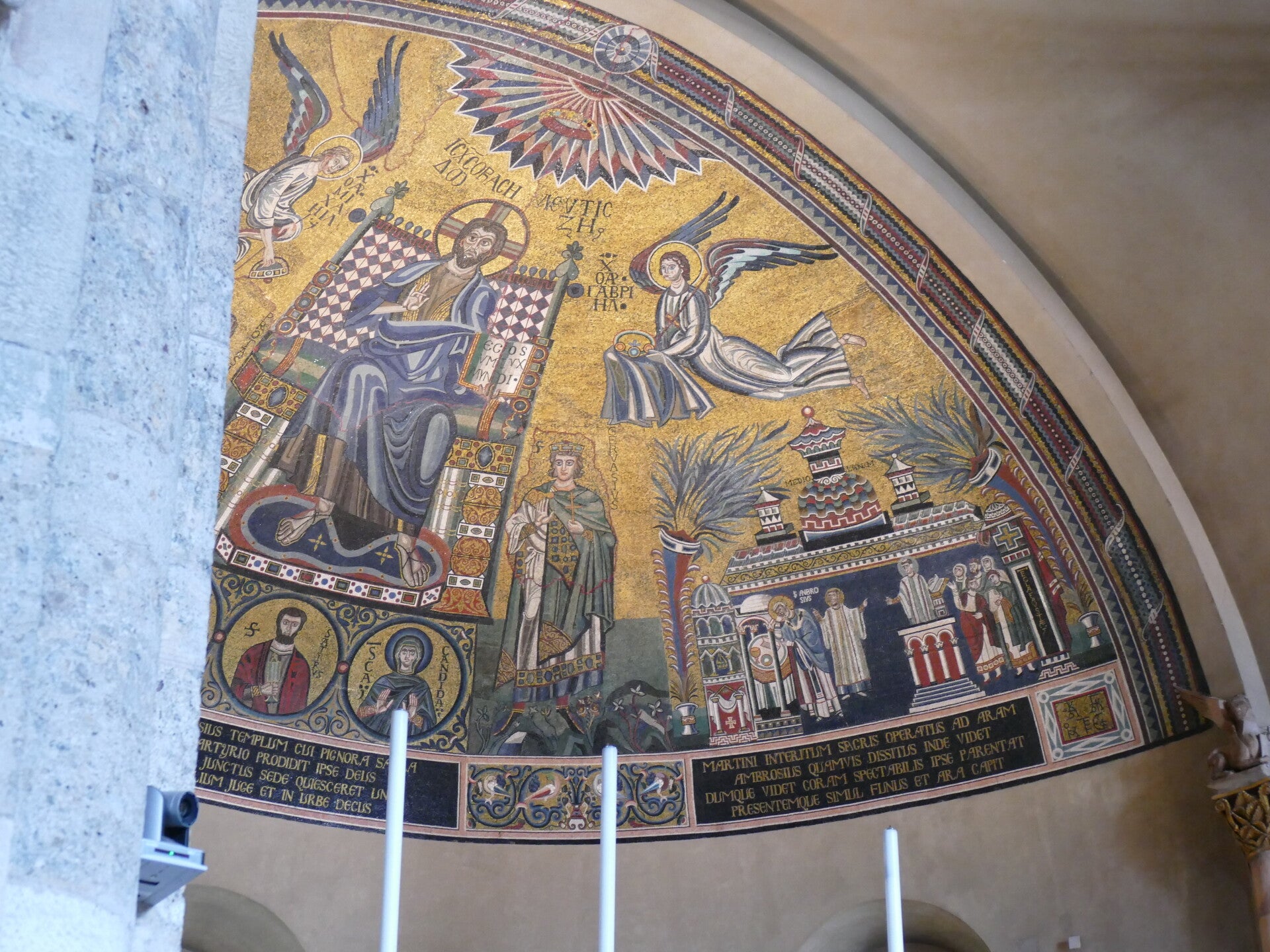Au fond de l’abside centrale, une mosaïque date des VIe et VIIIe siècles, largement remaniée aux XVIIIe – XIXe siècles, et partiellement reconstruite après le bombardement de Milan, qui a eu lieu pendant la Seconde Guerre mondiale, en réutilisant les restes de la mosaïque détruite par les bombes. Au centre, figure un Christ Rédempteur entre les saints Gervais et Protais en tenue militaire et, sur les côtés, deux scènes de la vie de saint Ambroise, spécifiquement celles liées à l'alliance entre les Églises milanaise et franque, à partir de laquelle un lien fort s'est constitué entre Milan et l'empire carolingien .
