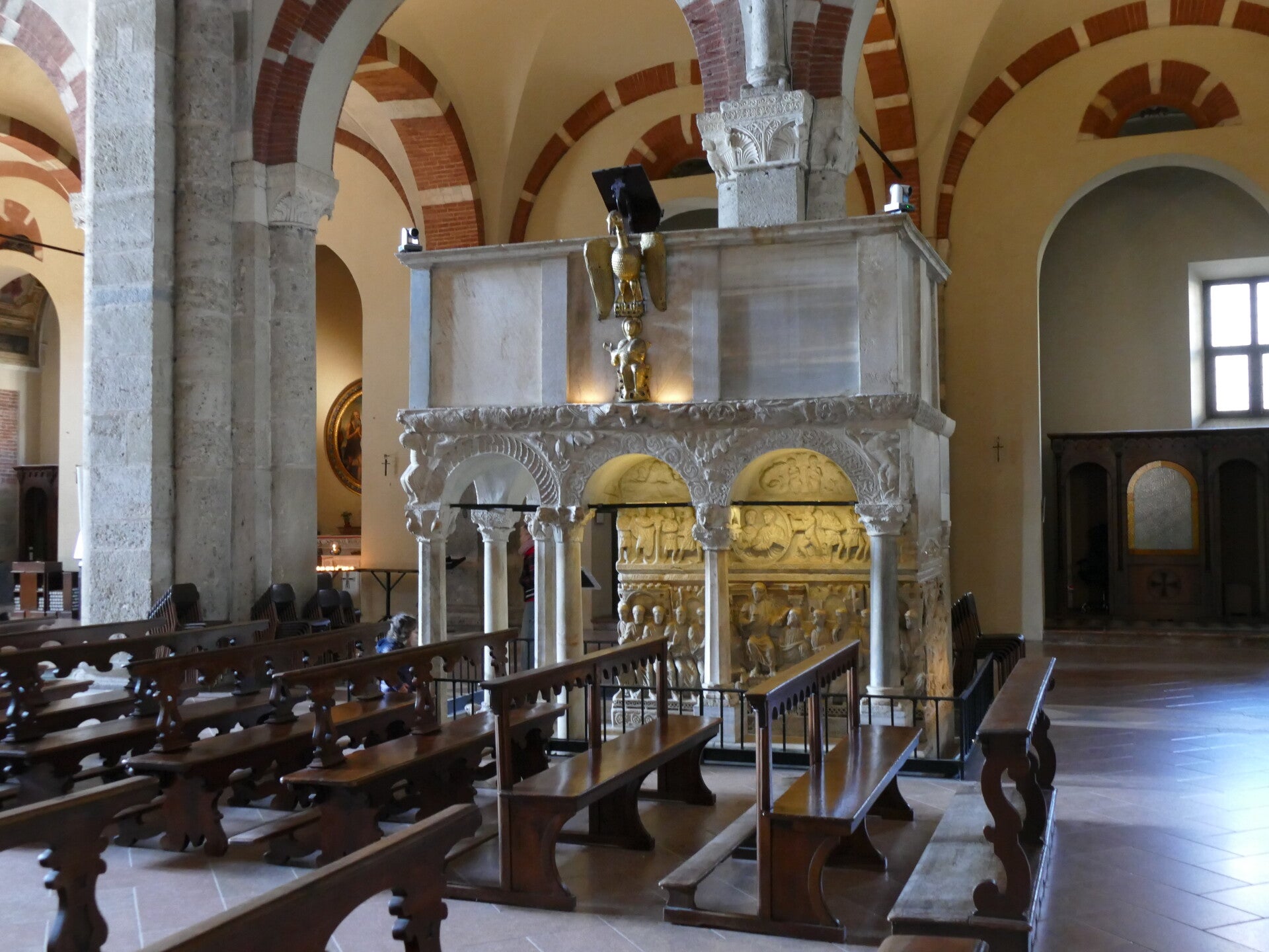 l'autel de Sant'Ambrogio est situé en son centre, construit entre 824 et 859 par Vuolvino et commandé par l'archevêque milanais Angilberto II. Son précieux antependim doré en relief avec des pierres serties sur les quatre côtés est une œuvre caractéristique et remarquable de l'orfèvrerie carolingienne. Angilberto II y est représenté, se faisant passer pour un donateur, alors qu'il est couronné évêque de Milan par saint Ambroise. À l'origine, l'autel abritait les corps des saints Ambroise, Gervais et Protais, transférés plus tard dans la crypte. La partie la plus richement décorée de l'autel est celle de devant, aux influences carolingiennes. Chef-d’œuvre de l’art carolingien et de la Renaissance lombarde, il est entouré de quatre colonnes de porphyre rouge d’origine antique, elles-mêmes surmontées de stucs du IXe siècle, le tout formant un ciborium à baldaquin. Des épisodes de la vie d’Ambroise sont figurés à l’extrémité du chœur : saint Ambroise, en présence de Gervais et Protais, reçoit l’hommage de deux moines (face arrière), Le Christ donne le mandat à Pierre et Paul (face avant), Saint Benoît honoré par deux moines (côté gauche) et Sainte Scholastique honorée par deux religieuses (côté droit).